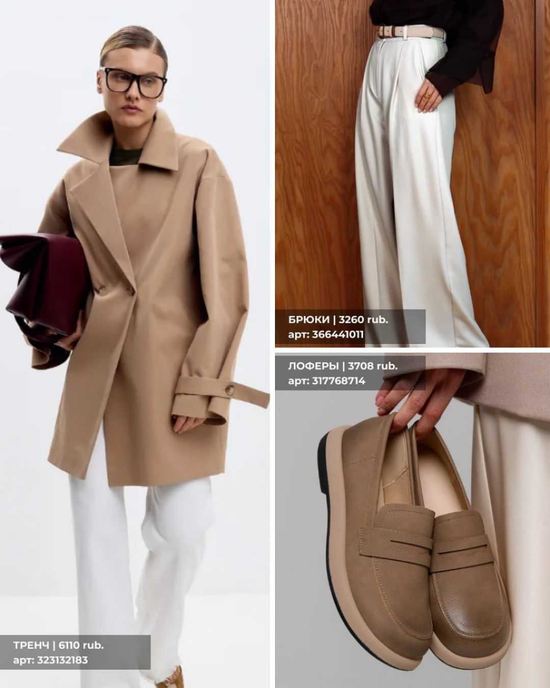Классический тренч и белые брюки создают безупречный деловой образ, который подчёркивает уверенность и профессионализм, оставаясь стильным и сдержанным.