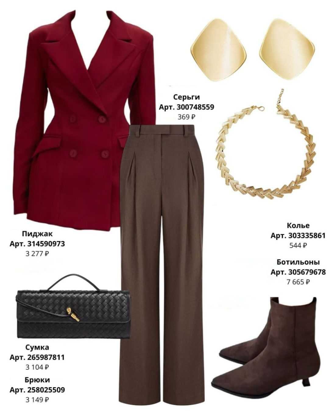 Тёплые коричневые тона в сочетании с акцентами глубокого красного создают выразительный и элегантный образ.