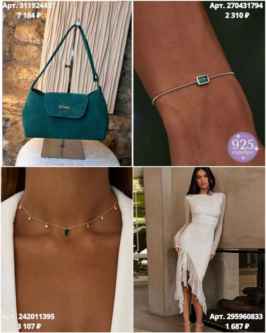 Платье с необычным кроем подчеркнёт твою фигуру, а тёмно-зелёные аксессуары добавят яркий акцент с элементами роскоши.